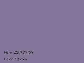 Hex #837799 Color is a normal violet color and the nearest color is Waterloo #7b7c94. Hex code #837799 and RGB value is rgb(131,119,153). In RGB color space, this color is composed of 51% red, 47% green, 60% blue, In CMYK color space, this color is composed of 14% cyan, 22% magenta, 0% yellow , 40% black , In HSL color space, this color has a hue angle of 261° , 14% saturation and 53% lightness.