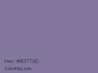 Hex #83779d Color is a normal indigo color and the nearest color is Waterloo #7b7c94. Hex code #83779d and RGB value is rgb(131,119,157). In RGB color space, this color is composed of 51% red, 47% green, 62% blue, In CMYK color space, this color is composed of 17% cyan, 24% magenta, 0% yellow , 38% black , In HSL color space, this color has a hue angle of 259° , 16% saturation and 54% lightness.
