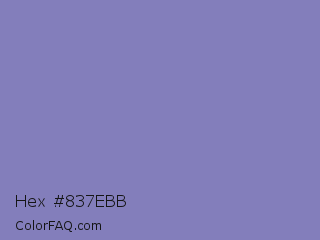 Hex #837ebb Color is a light indigo color and the nearest color is Ube #8878c3. Hex code #837ebb and RGB value is rgb(131,126,187). In RGB color space, this color is composed of 51% red, 49% green, 73% blue, In CMYK color space, this color is composed of 30% cyan, 33% magenta, 0% yellow , 27% black , In HSL color space, this color has a hue angle of 245° , 31% saturation and 61% lightness.