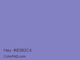 Hex #8380c4 Color is a light indigo color and the nearest color is Ube #8878c3. Hex code #8380c4 and RGB value is rgb(131,128,196). In RGB color space, this color is composed of 51% red, 50% green, 77% blue, In CMYK color space, this color is composed of 33% cyan, 35% magenta, 0% yellow , 23% black , In HSL color space, this color has a hue angle of 243° , 37% saturation and 64% lightness.