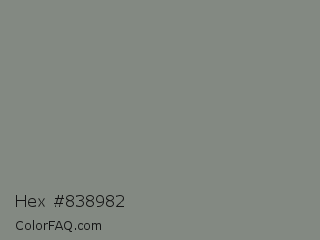 Hex #838982 Color is a normal green color and the nearest color is Gunsmoke #828685. Hex code #838982 and RGB value is rgb(131,137,130). In RGB color space, this color is composed of 51% red, 54% green, 51% blue, In CMYK color space, this color is composed of 4% cyan, 0% magenta, 5% yellow , 46% black , In HSL color space, this color has a hue angle of 111° , 3% saturation and 52% lightness.