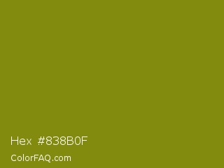 Hex #838b0f Color is a dark yellow color and the nearest color is Trendy Green #7c881a. Hex code #838b0f and RGB value is rgb(131,139,15). In RGB color space, this color is composed of 51% red, 55% green, 6% blue, In CMYK color space, this color is composed of 6% cyan, 0% magenta, 89% yellow , 45% black , In HSL color space, this color has a hue angle of 64° , 81% saturation and 30% lightness.