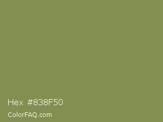 Hex #838f50 Color is a normal lime color and the nearest color is Moss Green #8a9a5b. Hex code #838f50 and RGB value is rgb(131,143,80). In RGB color space, this color is composed of 51% red, 56% green, 31% blue, In CMYK color space, this color is composed of 8% cyan, 0% magenta, 44% yellow , 44% black , In HSL color space, this color has a hue angle of 71° , 28% saturation and 44% lightness.