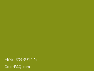 Hex #839115 Color is a normal yellow color and the nearest color is Trendy Green #7c881a. Hex code #839115 and RGB value is rgb(131,145,21). In RGB color space, this color is composed of 51% red, 57% green, 8% blue, In CMYK color space, this color is composed of 10% cyan, 0% magenta, 86% yellow , 43% black , In HSL color space, this color has a hue angle of 67° , 75% saturation and 33% lightness.