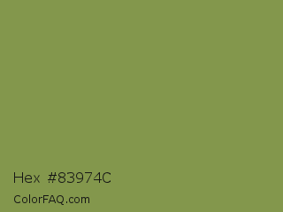 Hex #83974c Color is a normal lime color and the nearest color is Moss Green #8a9a5b. Hex code #83974c and RGB value is rgb(131,151,76). In RGB color space, this color is composed of 51% red, 59% green, 30% blue, In CMYK color space, this color is composed of 13% cyan, 0% magenta, 50% yellow , 41% black , In HSL color space, this color has a hue angle of 76° , 33% saturation and 45% lightness.