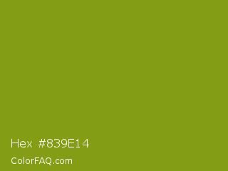 Hex #839e14 Color is a normal lime color and the nearest color is Trendy Green #7c881a. Hex code #839e14 and RGB value is rgb(131,158,20). In RGB color space, this color is composed of 51% red, 62% green, 8% blue, In CMYK color space, this color is composed of 17% cyan, 0% magenta, 87% yellow , 38% black , In HSL color space, this color has a hue angle of 72° , 78% saturation and 35% lightness.