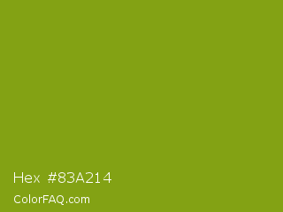 Hex #83a214 Color is a normal lime color and the nearest color is Limeade #6f9d02. Hex code #83a214 and RGB value is rgb(131,162,20). In RGB color space, this color is composed of 51% red, 64% green, 8% blue, In CMYK color space, this color is composed of 19% cyan, 0% magenta, 88% yellow , 36% black , In HSL color space, this color has a hue angle of 73° , 78% saturation and 36% lightness.