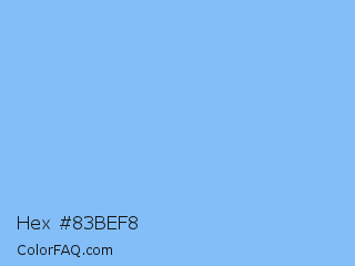 Hex #83bef8 Color is a light blue color and the nearest color is Jordy Blue #8ab9f1. Hex code #83bef8 and RGB value is rgb(131,190,248). In RGB color space, this color is composed of 51% red, 75% green, 97% blue, In CMYK color space, this color is composed of 47% cyan, 23% magenta, 0% yellow , 3% black , In HSL color space, this color has a hue angle of 210° , 89% saturation and 74% lightness.