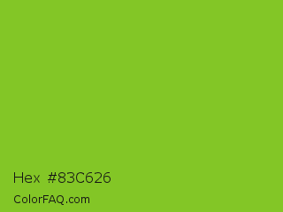 Hex #83c626 Color is a normal green color and the nearest color is Lima #76bd17. Hex code #83c626 and RGB value is rgb(131,198,38). In RGB color space, this color is composed of 51% red, 78% green, 15% blue, In CMYK color space, this color is composed of 34% cyan, 0% magenta, 81% yellow , 22% black , In HSL color space, this color has a hue angle of 85° , 68% saturation and 46% lightness.