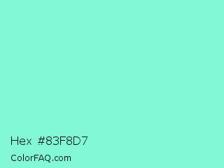 Hex #83f8d7 Color is a light green color and the nearest color is Aquamarine #7fffd4. Hex code #83f8d7 and RGB value is rgb(131,248,215). In RGB color space, this color is composed of 51% red, 97% green, 84% blue, In CMYK color space, this color is composed of 47% cyan, 0% magenta, 13% yellow , 3% black , In HSL color space, this color has a hue angle of 163° , 89% saturation and 74% lightness.
