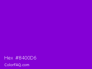 Hex #8400d6 Color is a normal purple color and the nearest color is French Violet #8806ce. Hex code #8400d6 and RGB value is rgb(132,0,214). In RGB color space, this color is composed of 52% red, 0% green, 84% blue, In CMYK color space, this color is composed of 38% cyan, 100% magenta, 0% yellow , 16% black , In HSL color space, this color has a hue angle of 277° , 100% saturation and 42% lightness.