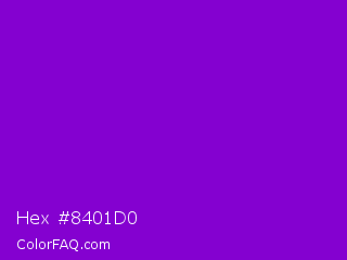 Hex #8401d0 Color is a normal purple color and the nearest color is French Violet #8806ce. Hex code #8401d0 and RGB value is rgb(132,1,208). In RGB color space, this color is composed of 52% red, 0% green, 82% blue, In CMYK color space, this color is composed of 37% cyan, 100% magenta, 0% yellow , 18% black , In HSL color space, this color has a hue angle of 278° , 99% saturation and 41% lightness.
