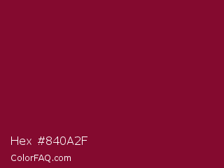 Hex #840a2f Color is a dark rose color and the nearest color is Monarch #8b0723. Hex code #840a2f and RGB value is rgb(132,10,47). In RGB color space, this color is composed of 52% red, 4% green, 18% blue, In CMYK color space, this color is composed of 0% cyan, 92% magenta, 64% yellow , 48% black , In HSL color space, this color has a hue angle of 342° , 86% saturation and 28% lightness.