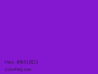 Hex #8418d1 Color is a normal purple color and the nearest color is French Violet #8806ce. Hex code #8418d1 and RGB value is rgb(132,24,209). In RGB color space, this color is composed of 52% red, 9% green, 82% blue, In CMYK color space, this color is composed of 37% cyan, 89% magenta, 0% yellow , 18% black , In HSL color space, this color has a hue angle of 275° , 79% saturation and 46% lightness.