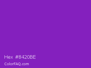 Hex #8420be Color is a normal purple color and the nearest color is French Violet #8806ce. Hex code #8420be and RGB value is rgb(132,32,190). In RGB color space, this color is composed of 52% red, 13% green, 75% blue, In CMYK color space, this color is composed of 31% cyan, 83% magenta, 0% yellow , 25% black , In HSL color space, this color has a hue angle of 278° , 71% saturation and 44% lightness.