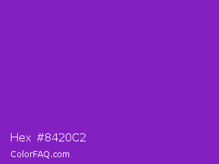 Hex #8420c2 Color is a normal purple color and the nearest color is French Violet #8806ce. Hex code #8420c2 and RGB value is rgb(132,32,194). In RGB color space, this color is composed of 52% red, 13% green, 76% blue, In CMYK color space, this color is composed of 32% cyan, 84% magenta, 0% yellow , 24% black , In HSL color space, this color has a hue angle of 277° , 72% saturation and 44% lightness.