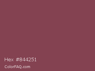 Hex #844251 Color is a normal red color and the nearest color is Deep Ruby #843f5b. Hex code #844251 and RGB value is rgb(132,66,81). In RGB color space, this color is composed of 52% red, 26% green, 32% blue, In CMYK color space, this color is composed of 0% cyan, 50% magenta, 39% yellow , 48% black , In HSL color space, this color has a hue angle of 346° , 33% saturation and 39% lightness.