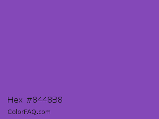 Hex #8448b8 Color is a normal purple color and the nearest color is Studio #714ab2. Hex code #8448b8 and RGB value is rgb(132,72,184). In RGB color space, this color is composed of 52% red, 28% green, 72% blue, In CMYK color space, this color is composed of 28% cyan, 61% magenta, 0% yellow , 28% black , In HSL color space, this color has a hue angle of 272° , 44% saturation and 50% lightness.