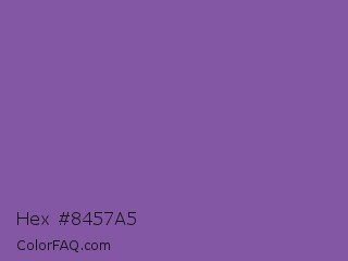 Hex #8457a5 Color is a normal purple color and the nearest color is Royal Purple #7851a9. Hex code #8457a5 and RGB value is rgb(132,87,165). In RGB color space, this color is composed of 52% red, 34% green, 65% blue, In CMYK color space, this color is composed of 20% cyan, 47% magenta, 0% yellow , 35% black , In HSL color space, this color has a hue angle of 275° , 31% saturation and 49% lightness.