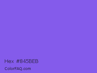 Hex #845beb Color is a light indigo color and the nearest color is Medium Slate Blue #7b68ee. Hex code #845beb and RGB value is rgb(132,91,235). In RGB color space, this color is composed of 52% red, 36% green, 92% blue, In CMYK color space, this color is composed of 44% cyan, 61% magenta, 0% yellow , 8% black , In HSL color space, this color has a hue angle of 257° , 78% saturation and 64% lightness.