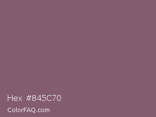 Hex #845c70 Color is a normal rose color and the nearest color is Falcon #7f626d. Hex code #845c70 and RGB value is rgb(132,92,112). In RGB color space, this color is composed of 52% red, 36% green, 44% blue, In CMYK color space, this color is composed of 0% cyan, 30% magenta, 15% yellow , 48% black , In HSL color space, this color has a hue angle of 330° , 18% saturation and 44% lightness.