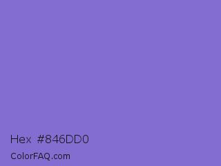 Hex #846dd0 Color is a light indigo color and the nearest color is True V #8a73d6. Hex code #846dd0 and RGB value is rgb(132,109,208). In RGB color space, this color is composed of 52% red, 43% green, 82% blue, In CMYK color space, this color is composed of 37% cyan, 48% magenta, 0% yellow , 18% black , In HSL color space, this color has a hue angle of 254° , 51% saturation and 62% lightness.