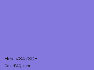 Hex #8478df Color is a light indigo color and the nearest color is Chetwode Blue #8581d9. Hex code #8478df and RGB value is rgb(132,120,223). In RGB color space, this color is composed of 52% red, 47% green, 87% blue, In CMYK color space, this color is composed of 41% cyan, 46% magenta, 0% yellow , 13% black , In HSL color space, this color has a hue angle of 247° , 62% saturation and 67% lightness.