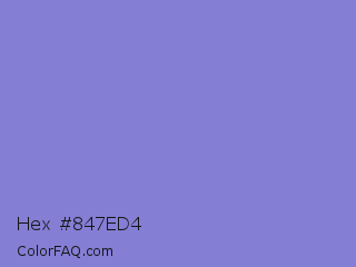 Hex #847ed4 Color is a light indigo color and the nearest color is Chetwode Blue #8581d9. Hex code #847ed4 and RGB value is rgb(132,126,212). In RGB color space, this color is composed of 52% red, 49% green, 83% blue, In CMYK color space, this color is composed of 38% cyan, 41% magenta, 0% yellow , 17% black , In HSL color space, this color has a hue angle of 244° , 50% saturation and 66% lightness.
