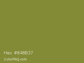 Hex #848b37 Color is a normal yellow color and the nearest color is Sycamore #908d39. Hex code #848b37 and RGB value is rgb(132,139,55). In RGB color space, this color is composed of 52% red, 55% green, 22% blue, In CMYK color space, this color is composed of 5% cyan, 0% magenta, 60% yellow , 45% black , In HSL color space, this color has a hue angle of 65° , 43% saturation and 38% lightness.