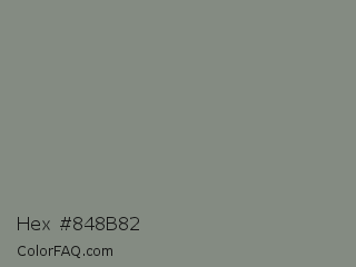 Hex #848b82 Color is a normal green color and the nearest color is Dolphin Gray #828e84. Hex code #848b82 and RGB value is rgb(132,139,130). In RGB color space, this color is composed of 52% red, 55% green, 51% blue, In CMYK color space, this color is composed of 5% cyan, 0% magenta, 6% yellow , 45% black , In HSL color space, this color has a hue angle of 107° , 4% saturation and 53% lightness.