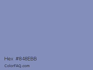 Hex #848ebb Color is a light blue color and the nearest color is Wild Blue Yonder #7a89b8. Hex code #848ebb and RGB value is rgb(132,142,187). In RGB color space, this color is composed of 52% red, 56% green, 73% blue, In CMYK color space, this color is composed of 29% cyan, 24% magenta, 0% yellow , 27% black , In HSL color space, this color has a hue angle of 229° , 29% saturation and 63% lightness.
