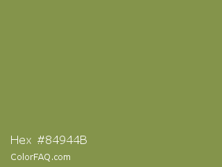 Hex #84944b Color is a normal lime color and the nearest color is Moss Green #8a9a5b. Hex code #84944b and RGB value is rgb(132,148,75). In RGB color space, this color is composed of 52% red, 58% green, 29% blue, In CMYK color space, this color is composed of 11% cyan, 0% magenta, 49% yellow , 42% black , In HSL color space, this color has a hue angle of 73° , 33% saturation and 44% lightness.