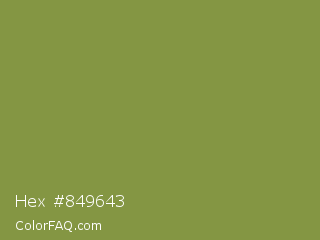 Hex #849643 Color is a normal lime color and the nearest color is Sycamore #908d39. Hex code #849643 and RGB value is rgb(132,150,67). In RGB color space, this color is composed of 52% red, 59% green, 26% blue, In CMYK color space, this color is composed of 12% cyan, 0% magenta, 55% yellow , 41% black , In HSL color space, this color has a hue angle of 73° , 38% saturation and 43% lightness.