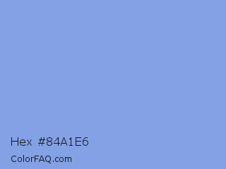 Hex #84a1e6 Color is a light blue color and the nearest color is Portage #8b9fee. Hex code #84a1e6 and RGB value is rgb(132,161,230). In RGB color space, this color is composed of 52% red, 63% green, 90% blue, In CMYK color space, this color is composed of 43% cyan, 30% magenta, 0% yellow , 10% black , In HSL color space, this color has a hue angle of 222° , 66% saturation and 71% lightness.