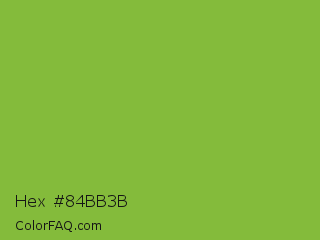 Hex #84bb3b Color is a normal green color and the nearest color is Sushi #87ab39. Hex code #84bb3b and RGB value is rgb(132,187,59). In RGB color space, this color is composed of 52% red, 73% green, 23% blue, In CMYK color space, this color is composed of 29% cyan, 0% magenta, 68% yellow , 27% black , In HSL color space, this color has a hue angle of 86° , 52% saturation and 48% lightness.