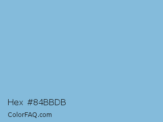 Hex #84bbdb Color is a light blue color and the nearest color is Dark Sky Blue #8cbed6. Hex code #84bbdb and RGB value is rgb(132,187,219). In RGB color space, this color is composed of 52% red, 73% green, 86% blue, In CMYK color space, this color is composed of 40% cyan, 15% magenta, 0% yellow , 14% black , In HSL color space, this color has a hue angle of 202° , 55% saturation and 69% lightness.