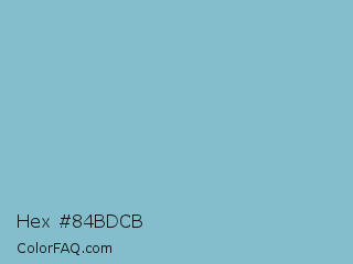 Hex #84bdcb Color is a light cyan color and the nearest color is Half Baked #85c4cc. Hex code #84bdcb and RGB value is rgb(132,189,203). In RGB color space, this color is composed of 52% red, 74% green, 80% blue, In CMYK color space, this color is composed of 35% cyan, 7% magenta, 0% yellow , 20% black , In HSL color space, this color has a hue angle of 192° , 41% saturation and 66% lightness.