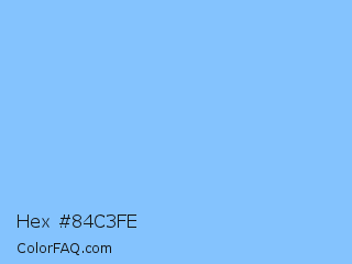 Hex #84c3fe Color is a light blue color and the nearest color is Malibu #7dc8f7. Hex code #84c3fe and RGB value is rgb(132,195,254). In RGB color space, this color is composed of 52% red, 76% green, 100% blue, In CMYK color space, this color is composed of 48% cyan, 23% magenta, 0% yellow , 0% black , In HSL color space, this color has a hue angle of 209° , 98% saturation and 76% lightness.