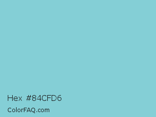 Hex #84cfd6 Color is a light cyan color and the nearest color is Half Baked #85c4cc. Hex code #84cfd6 and RGB value is rgb(132,207,214). In RGB color space, this color is composed of 52% red, 81% green, 84% blue, In CMYK color space, this color is composed of 38% cyan, 3% magenta, 0% yellow , 16% black , In HSL color space, this color has a hue angle of 185° , 50% saturation and 68% lightness.