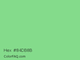 Hex #84db8b Color is a light green color and the nearest color is Light Green #90ee90. Hex code #84db8b and RGB value is rgb(132,219,139). In RGB color space, this color is composed of 52% red, 86% green, 55% blue, In CMYK color space, this color is composed of 40% cyan, 0% magenta, 37% yellow , 14% black , In HSL color space, this color has a hue angle of 125° , 55% saturation and 69% lightness.