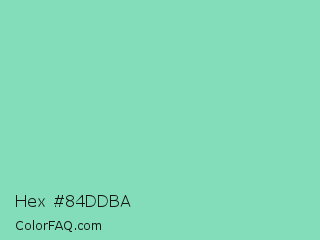 Hex #84ddba Color is a light green color and the nearest color is Pearl Aqua #88d8c0. Hex code #84ddba and RGB value is rgb(132,221,186). In RGB color space, this color is composed of 52% red, 87% green, 73% blue, In CMYK color space, this color is composed of 40% cyan, 0% magenta, 16% yellow , 13% black , In HSL color space, this color has a hue angle of 156° , 57% saturation and 69% lightness.