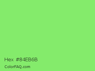 Hex #84eb6b Color is a light green color and the nearest color is Pastel Green #77dd77. Hex code #84eb6b and RGB value is rgb(132,235,107). In RGB color space, this color is composed of 52% red, 92% green, 42% blue, In CMYK color space, this color is composed of 44% cyan, 0% magenta, 54% yellow , 8% black , In HSL color space, this color has a hue angle of 108° , 76% saturation and 67% lightness.