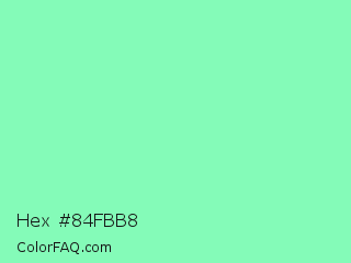 Hex #84fbb8 Color is a light green color and the nearest color is Aquamarine #7fffd4. Hex code #84fbb8 and RGB value is rgb(132,251,184). In RGB color space, this color is composed of 52% red, 98% green, 72% blue, In CMYK color space, this color is composed of 47% cyan, 0% magenta, 27% yellow , 2% black , In HSL color space, this color has a hue angle of 146° , 94% saturation and 75% lightness.