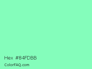 Hex #84fdbb Color is a light green color and the nearest color is Aquamarine #7fffd4. Hex code #84fdbb and RGB value is rgb(132,253,187). In RGB color space, this color is composed of 52% red, 99% green, 73% blue, In CMYK color space, this color is composed of 48% cyan, 0% magenta, 26% yellow , 1% black , In HSL color space, this color has a hue angle of 147° , 97% saturation and 75% lightness.