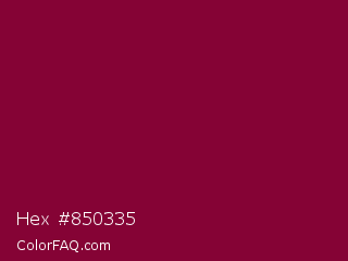 Hex #850335 Color is a dark rose color and the nearest color is Siren #7a013a. Hex code #850335 and RGB value is rgb(133,3,53). In RGB color space, this color is composed of 52% red, 1% green, 21% blue, In CMYK color space, this color is composed of 0% cyan, 98% magenta, 60% yellow , 48% black , In HSL color space, this color has a hue angle of 337° , 96% saturation and 27% lightness.
