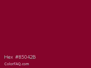 Hex #85042b Color is a dark rose color and the nearest color is Paprika #8d0226. Hex code #85042b and RGB value is rgb(133,4,43). In RGB color space, this color is composed of 52% red, 2% green, 17% blue, In CMYK color space, this color is composed of 0% cyan, 97% magenta, 68% yellow , 48% black , In HSL color space, this color has a hue angle of 342° , 94% saturation and 27% lightness.