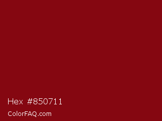 Hex #850711 Color is a dark red color and the nearest color is Red Devil #860111. Hex code #850711 and RGB value is rgb(133,7,17). In RGB color space, this color is composed of 52% red, 3% green, 7% blue, In CMYK color space, this color is composed of 0% cyan, 95% magenta, 87% yellow , 48% black , In HSL color space, this color has a hue angle of 355° , 90% saturation and 27% lightness.