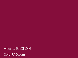 Hex #850d3b Color is a dark rose color and the nearest color is Rose Bud Cherry #800b47. Hex code #850d3b and RGB value is rgb(133,13,59). In RGB color space, this color is composed of 52% red, 5% green, 23% blue, In CMYK color space, this color is composed of 0% cyan, 90% magenta, 56% yellow , 48% black , In HSL color space, this color has a hue angle of 337° , 82% saturation and 29% lightness.