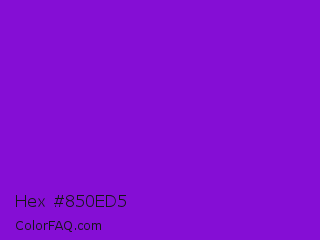 Hex #850ed5 Color is a normal purple color and the nearest color is French Violet #8806ce. Hex code #850ed5 and RGB value is rgb(133,14,213). In RGB color space, this color is composed of 52% red, 5% green, 84% blue, In CMYK color space, this color is composed of 38% cyan, 93% magenta, 0% yellow , 16% black , In HSL color space, this color has a hue angle of 276° , 88% saturation and 45% lightness.