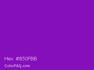 Hex #850fbb Color is a normal purple color and the nearest color is Violet RYB #8601af. Hex code #850fbb and RGB value is rgb(133,15,187). In RGB color space, this color is composed of 52% red, 6% green, 73% blue, In CMYK color space, this color is composed of 29% cyan, 92% magenta, 0% yellow , 27% black , In HSL color space, this color has a hue angle of 281° , 85% saturation and 40% lightness.
